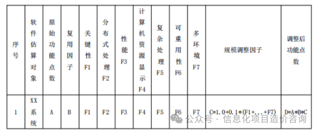 (二)调整后功能点数FP=RE(复用因子)xUFPxVAF(规模调整因子)。复用因子与我们常用的复用度、重用程度的概念实质是一样的,一般取值是0.5-1.0;规模调整因子取值范围一般为1.0-2.4。其中,规模调整因子VAF=1.0+0.1x(Fl+F2+F3+F4+F5+F6+F7)。详细可以参考下表: