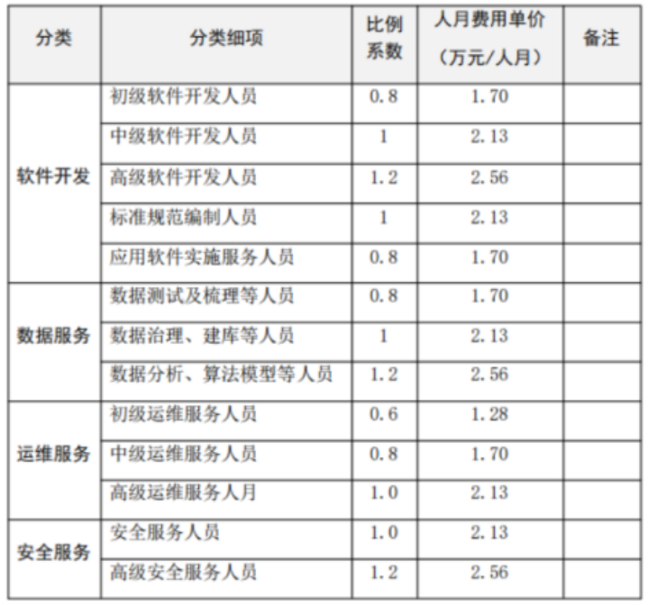 本标准规定人月费用基准单价为 2.13 万元/人月,该基准费用包含直接人力成本、间接人力成本、间接非人力成本及合理利润(含税),但不包括直接非人力成本。对比《中国软件行业基准数据》海口2023年人月费用为22289元,2022年人月费用为21953元,与本标准相比较差距不大。根据人月费用参考基准价,人月以 21.75 天计。同时,从软件开发、数据服务、运维服务和安全服务4个维度给出具体的费用比例系数,详见下表: