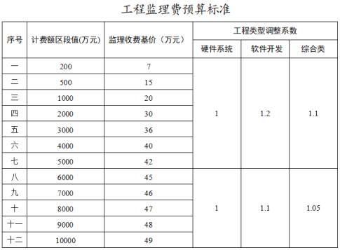 7.工程监理费适用于信息化建设项目施工阶段的质量、进度、费用控制管理和安全、合同、信息等方面协调管理服务,以及勘察、设计、保修等阶段的相关工程服务。综合考虑市场价格等因素,工程监理费按以下收费标准计取:
